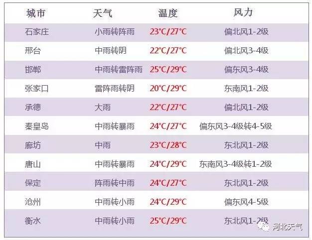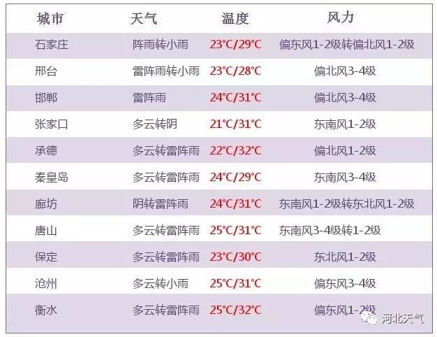 明天白天,全省阴有小到中雨,其中承德、唐山、秦皇岛、沧州、衡水、邢台东部、邯郸东部有中到大雨。
